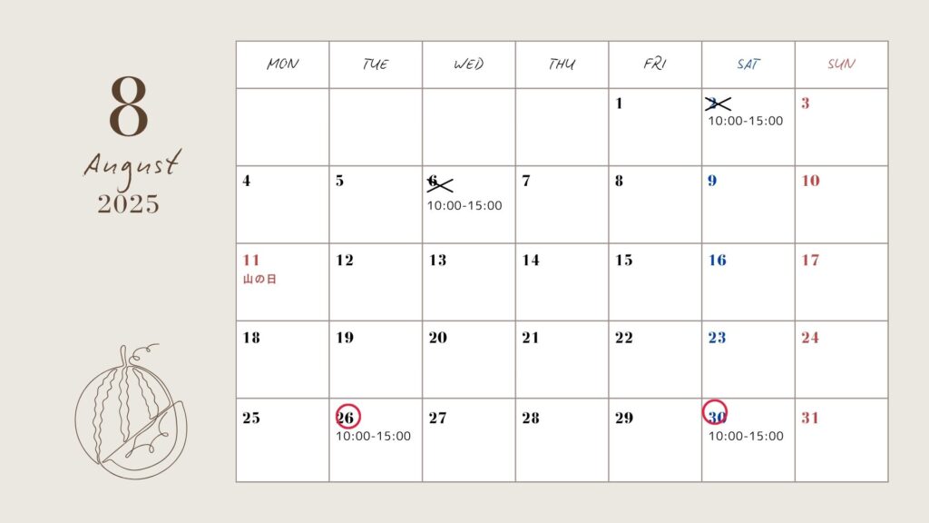 2025.07.03 その他 2025年8月のご予約について 2025年8月の受付は終了いたしました。いつもありがとうございます。9月のご予約については、お気軽にContactよりお問い合わせください。